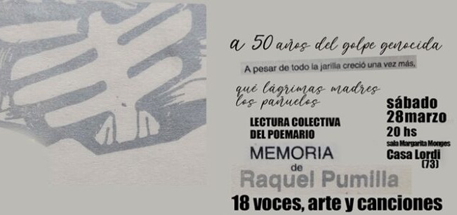 “A pesar de todo la jarilla creció una vez más”.La agremiación cultural APE junto a la Biblioteca Popular Edgar Morisoli- en el marco de las actividades conmemorativas a los 50 años del golpe genocida- invitan a la lectura colectiva del poemario “Memoria” de la recordada artista popular Raquel Pumilla. “A pesar de todo la jarilla creció una vez más”.